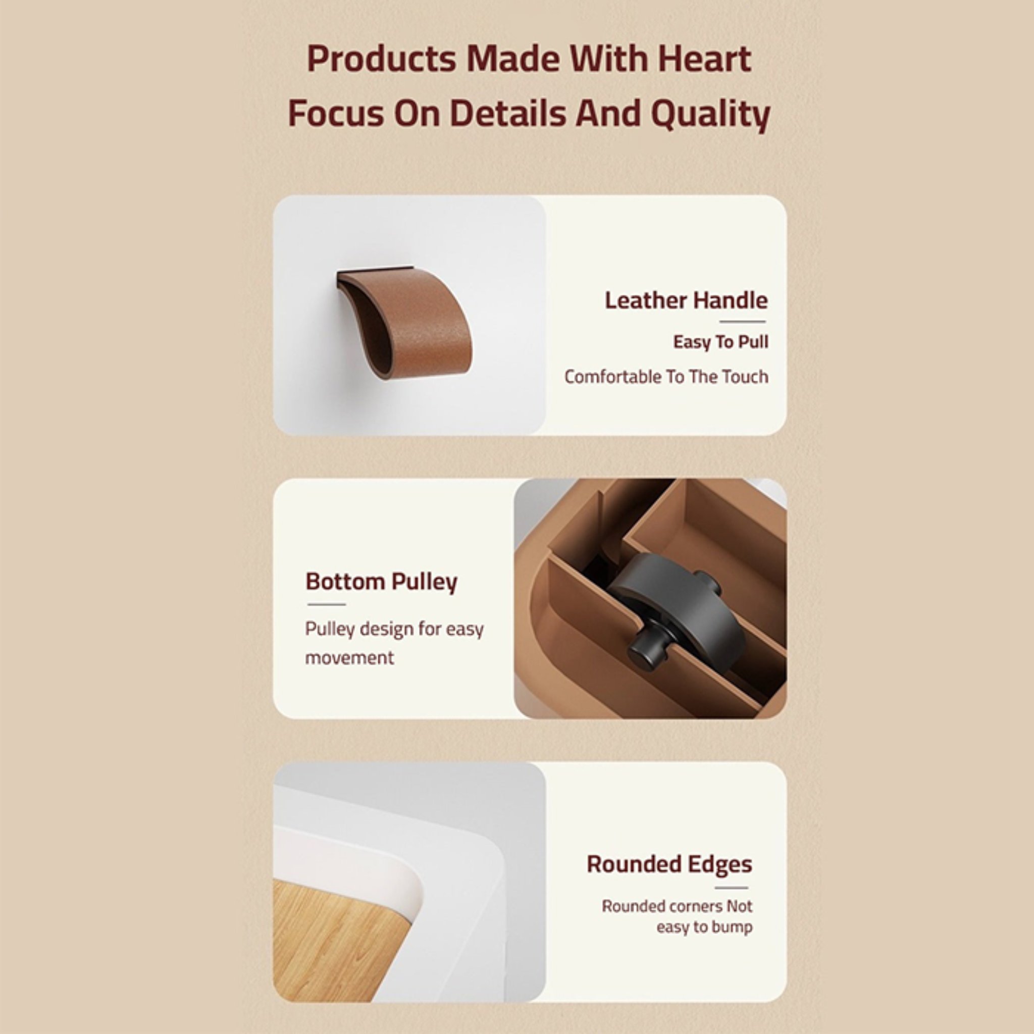 Leather drawer handles - Soft to the touch and easy to grip, they add a premium touch and ease of use.