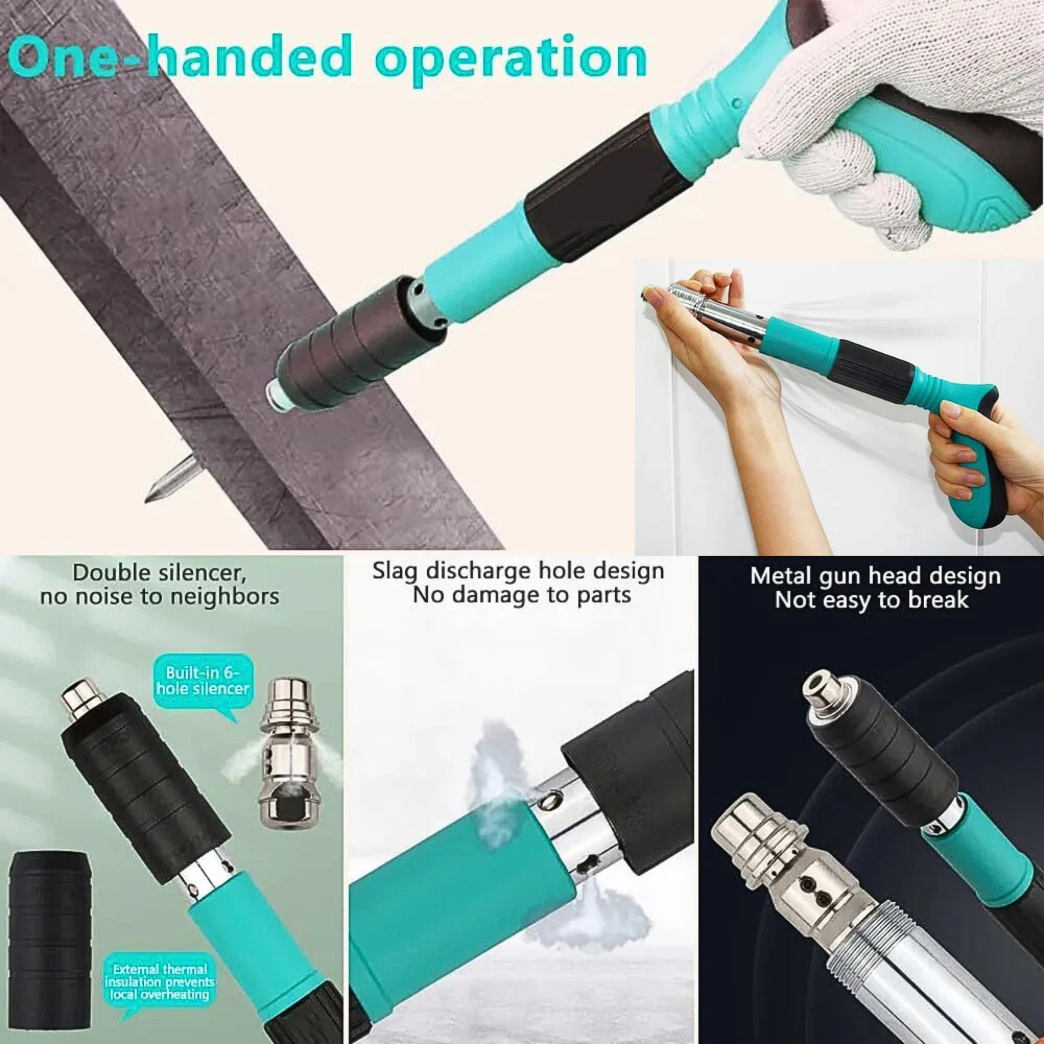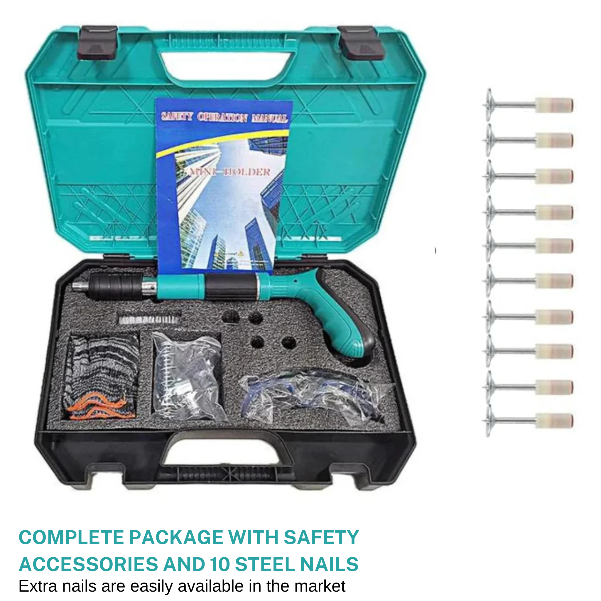 ✅ مجموعة أدوات كاملة : تتضمن مسدس مسامير، و10 مسامير فولاذية، وقفازات، ونظارات أمان، ومواد تشحيم، وفرشاة تنظيف، ومجموعة ملحقات.