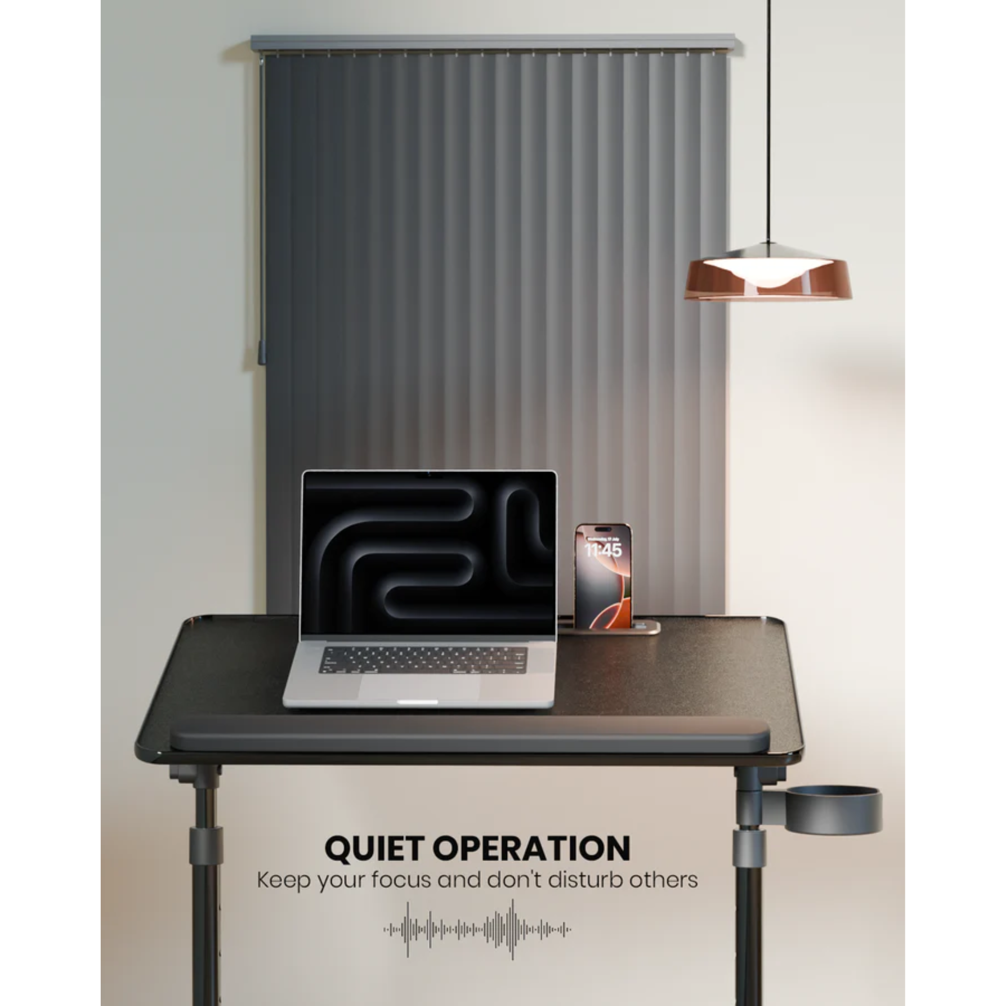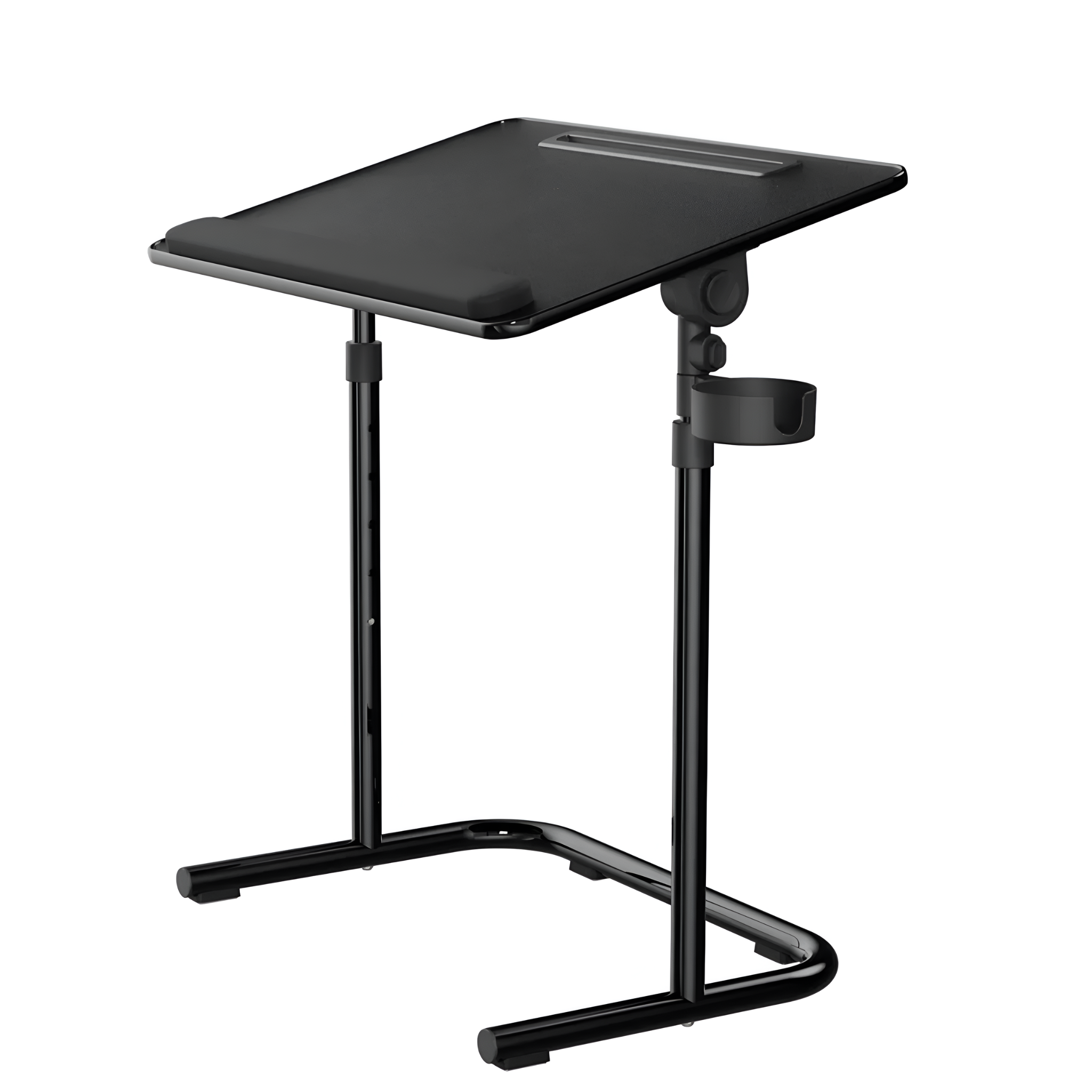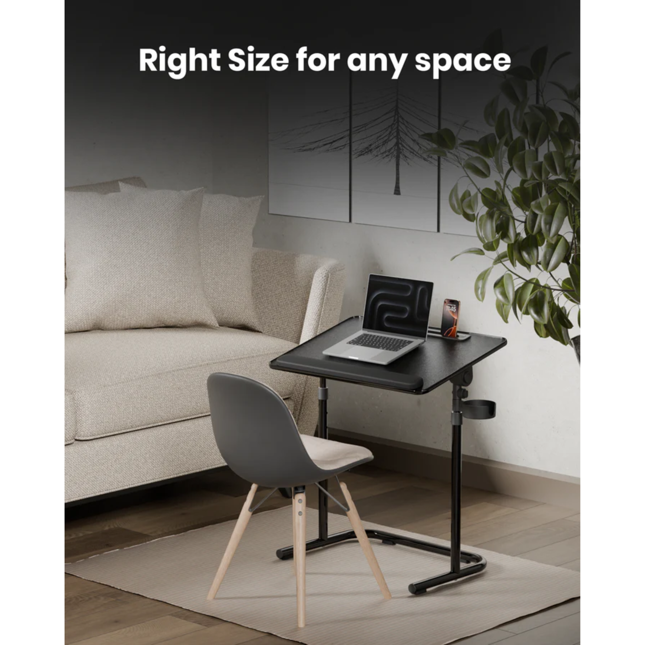 Moxedo FlexMate Adjustable Height Desk for Laptop with Ergonomic Tilt-top Surface with Side-Mounted Cup Holder, Wrist Rest and Device Slot for Phone and Tablet.